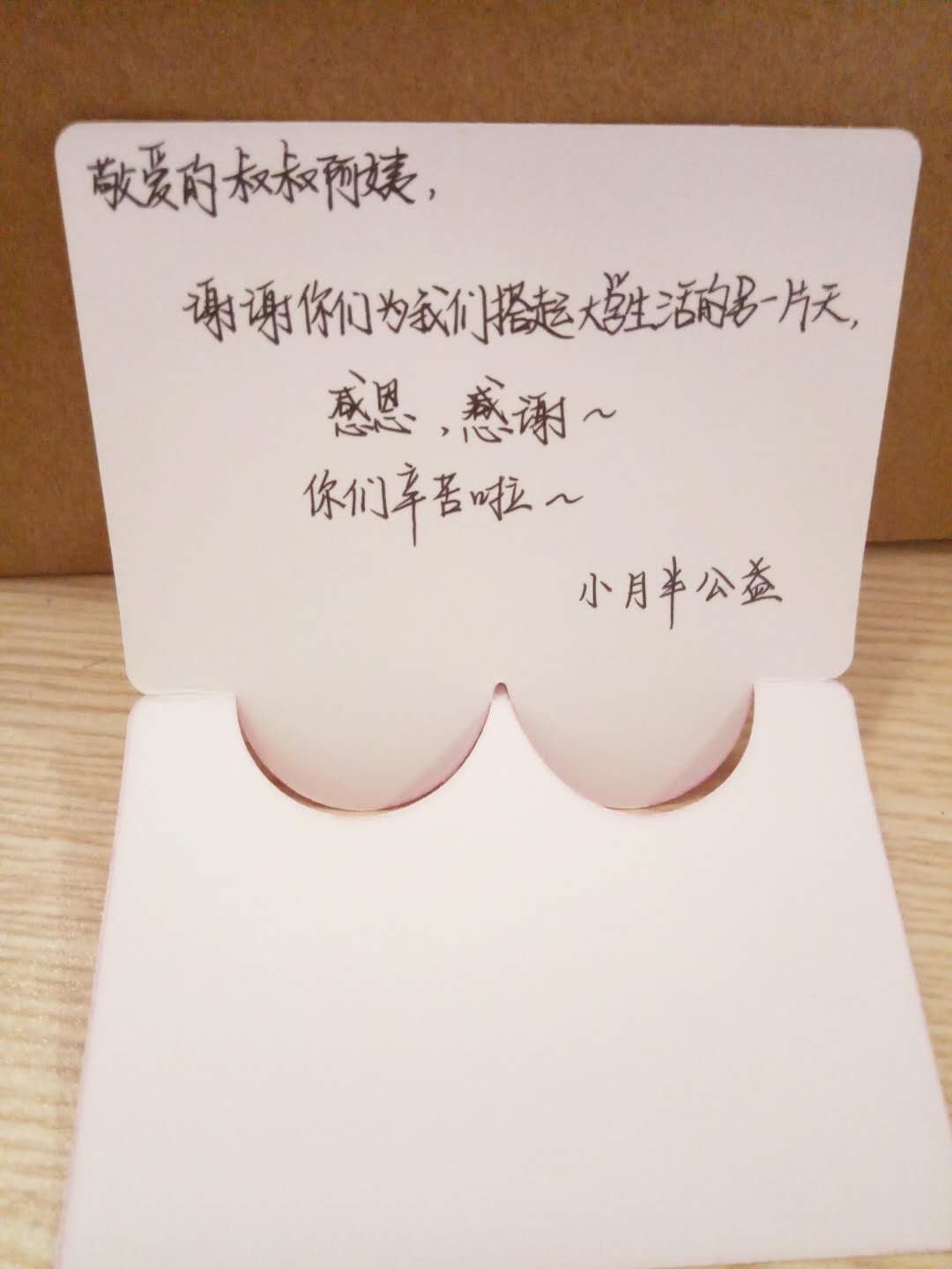 近日,公共管理学院15级同学们以“小月半公益”名义,走访各个学生宿舍小区,给每个小区管理员送小礼品,感恩宿舍管理员的辛勤劳动。此举使宿舍管理员倍感温暖,觉得再苦再累也值得,都决心要更加努力的工作,做好服务,让学生有更舒适的生活、休息、学习环境。