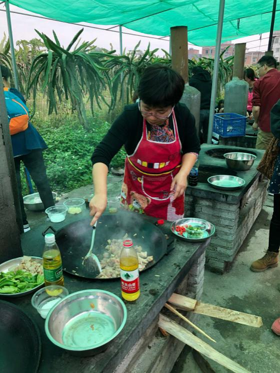 7:40,大家齐聚教学楼前整队出发,首先去农庄摘果,有的摘杨桃,有的摘桑葚,一边品尝果子,一路欢声笑语,兴奋和喜悦浮现在每个人的脸上。随后,到达野炊现场,由后勤处副处长刘铁梅主持抽签,将全体人员分为四个小组。有的拾柴生火,有的洗碗摆盘,有的切菜配料打下手,有的围裙一系锅铲一颠开始掌勺,忙得不亦乐乎!炊烟儿袅袅升起,香味儿阵阵扑鼻,经过近两小时的煎、炸、蒸、炒、煮,一桌桌色香味俱全的“满汉全席”呈现在眼前,大家围坐在一起,津津有味地品尝自己的劳动成果,一个字:香!
