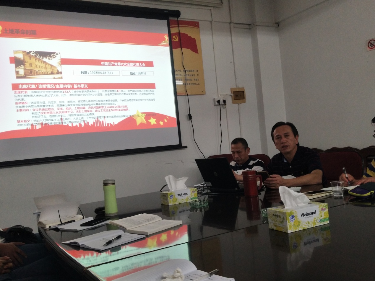 莫云光书记结合自主题教育活动开展以来,自身的学习及调研体会,带领党员同志一起回顾了党的历史、中国共产党历次全国代表大会征程。为了更系统、全面的给党员同志们分享更详尽的党史、革命史等,需分三次党课进行,本次党课重点从自新民主主义革命时期到抗日战争时期期间召开的党的一大至七大以来的光辉历程,依次对大会的历史背景、出席代表、选举情况、大会内容、历史意义等进行全面阐述。