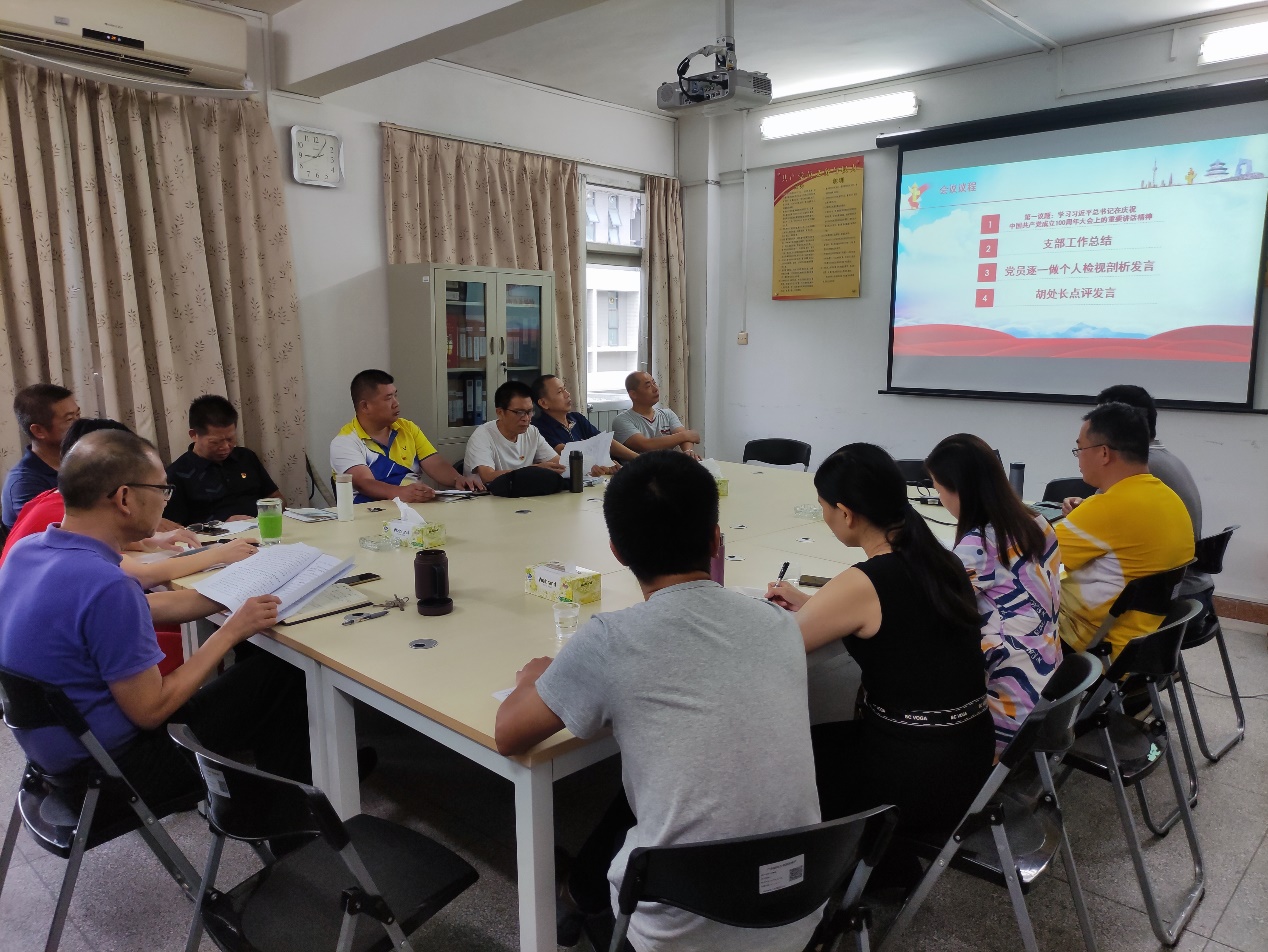 首先,支部书记黄俊生带领党员学习习近平总书记在庆祝中国共产党成立100周年大会上的重要讲话精神,随后,代表党支部向全体支部党员作2021年上半年支部工作总结,对支部半年来党史学习教育的开展情况及即将开展的“我为群众办实事”等方面作了详细汇报,通报了党支部委员会检视问题情况,对党支部工作中存在的不足也进行了深入分析,并列入支部下一阶段的整改措施。