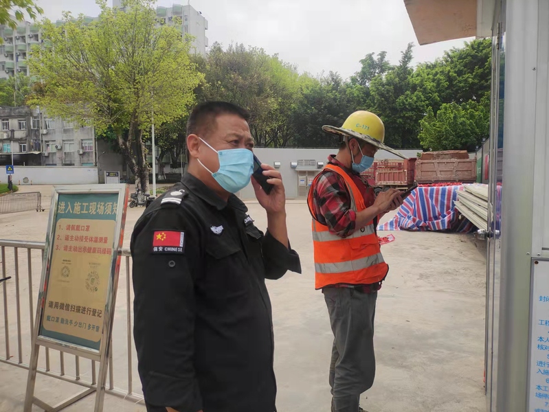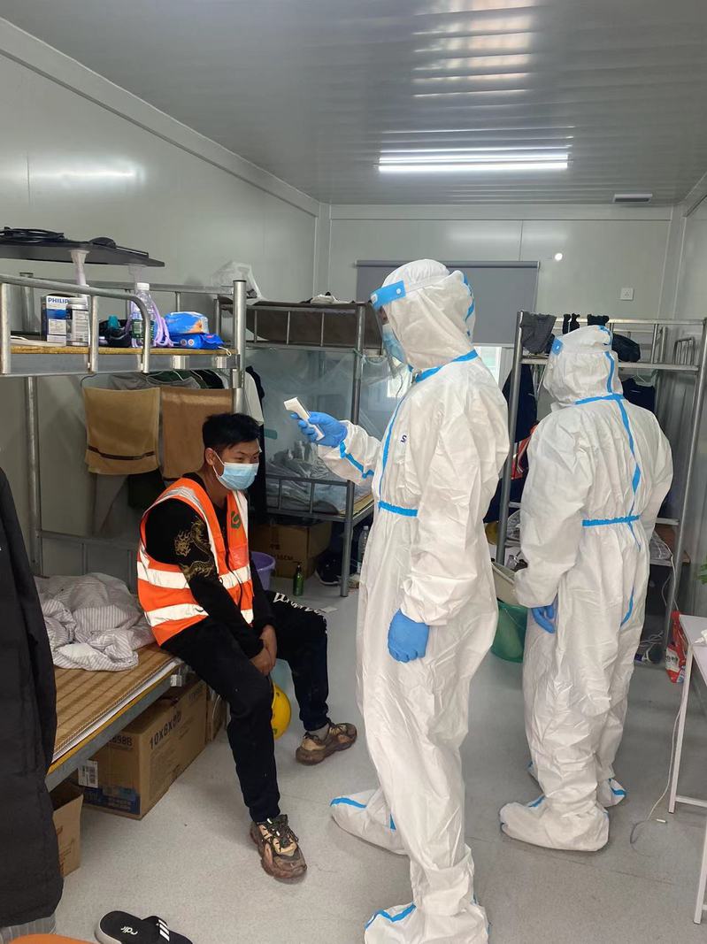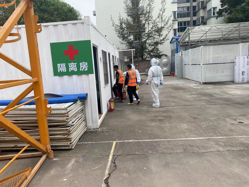 演练注重工地新冠肺炎疫情防控全流程性,共有六个场景:一是项目部出入口测量体温时发现发热疑似疫情案例,临时安置,报告项目部疫情防控领导小组;二是预警、启动应急处置预案,报告相关上级主管部门;三是救护车运送患者到定点医院观察隔离;四是对疑似疫情者、密切接触者隔离观察;五是对疑似疫情者活动区域进行消毒处理。六是组织开展全员核酸检测。