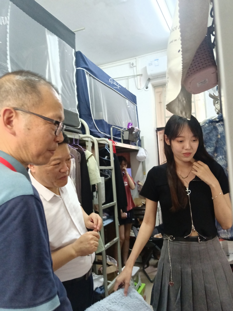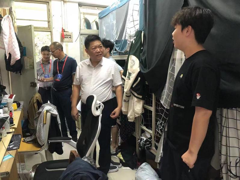 刘祖华一行走进学生宿舍,查看宿舍内外的环境卫生、安全状况及宿舍安全教育宣传,与学生亲切交流,倾听学生的心声,深入了解学生的生活状况,重点检查了学生宿舍卫生状况、是否有使用违章电器、有无私拉乱接电线、是否有安全隐患等情况,叮嘱同学们一定要注意用电安全,增强安全用电意识和防火防盗意识,自觉保持宿舍干净整洁,坚决杜绝使用大功率电器和乱拉电线等违规行为,确保学生宿舍的安全稳定。胡卫标向校领导介绍了后勤处在管理育人、服务育人、环境育人等方面的举措,详细汇报了学生居住环境条件、宿舍日常安全管理、安全宣传氛围营造及《william威廉中文官网学生宿舍违章电器教育整治工作方案》贯彻落实情况等。