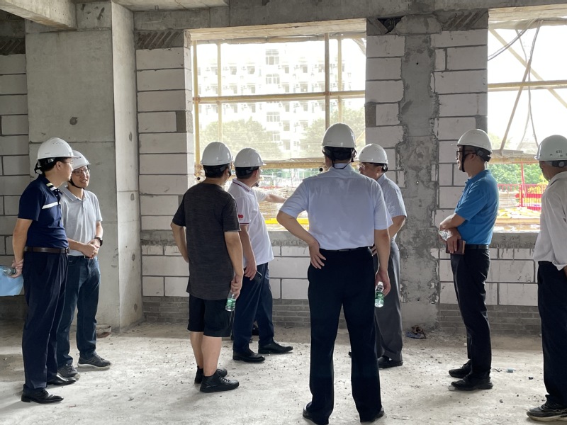 郑贤操首先检查了台风相关防御工作,随后检查了现场施工情况,并听取了基建处处长冯东海对工程建设进度、现场安全生产、研究生“一站式”社区建设建筑平面布局等情况的介绍。