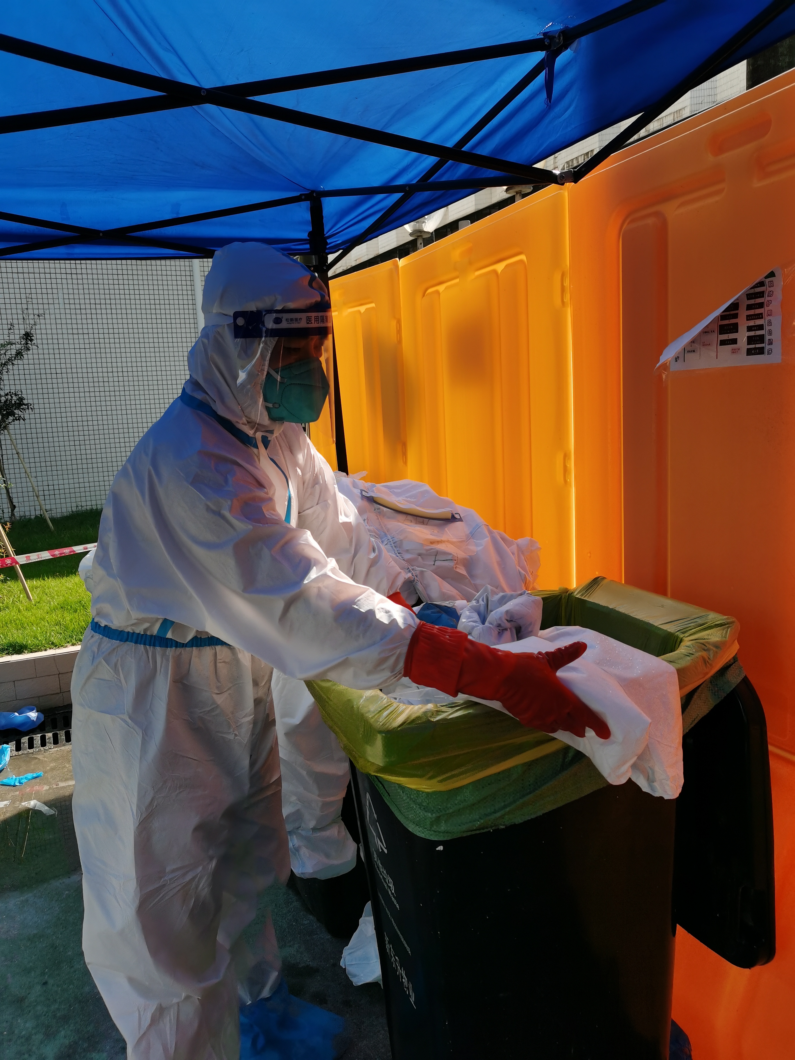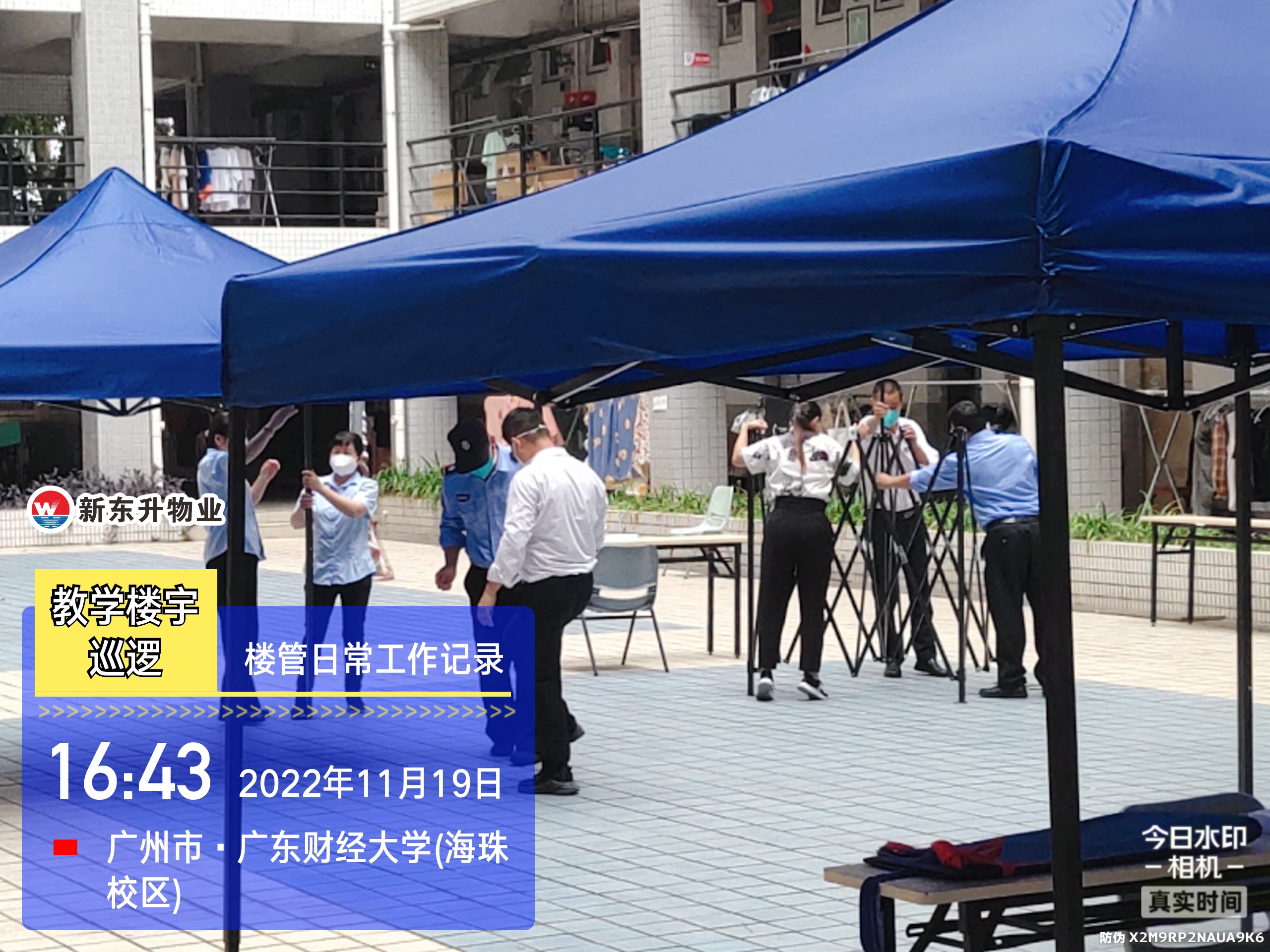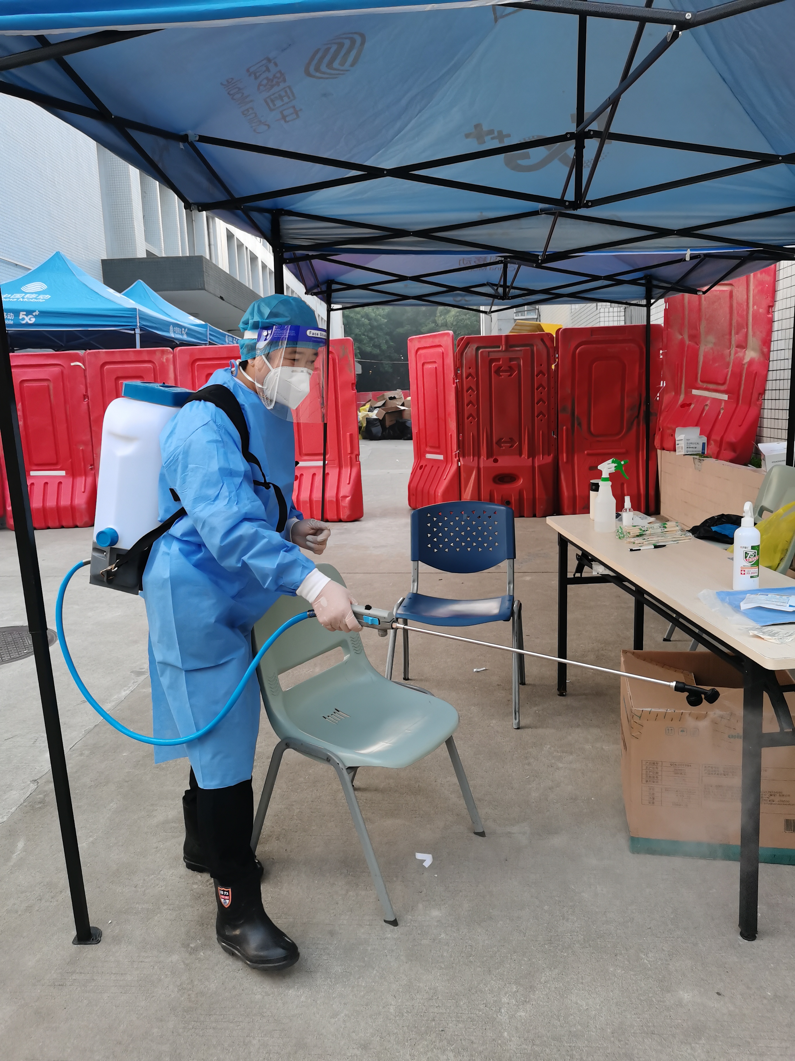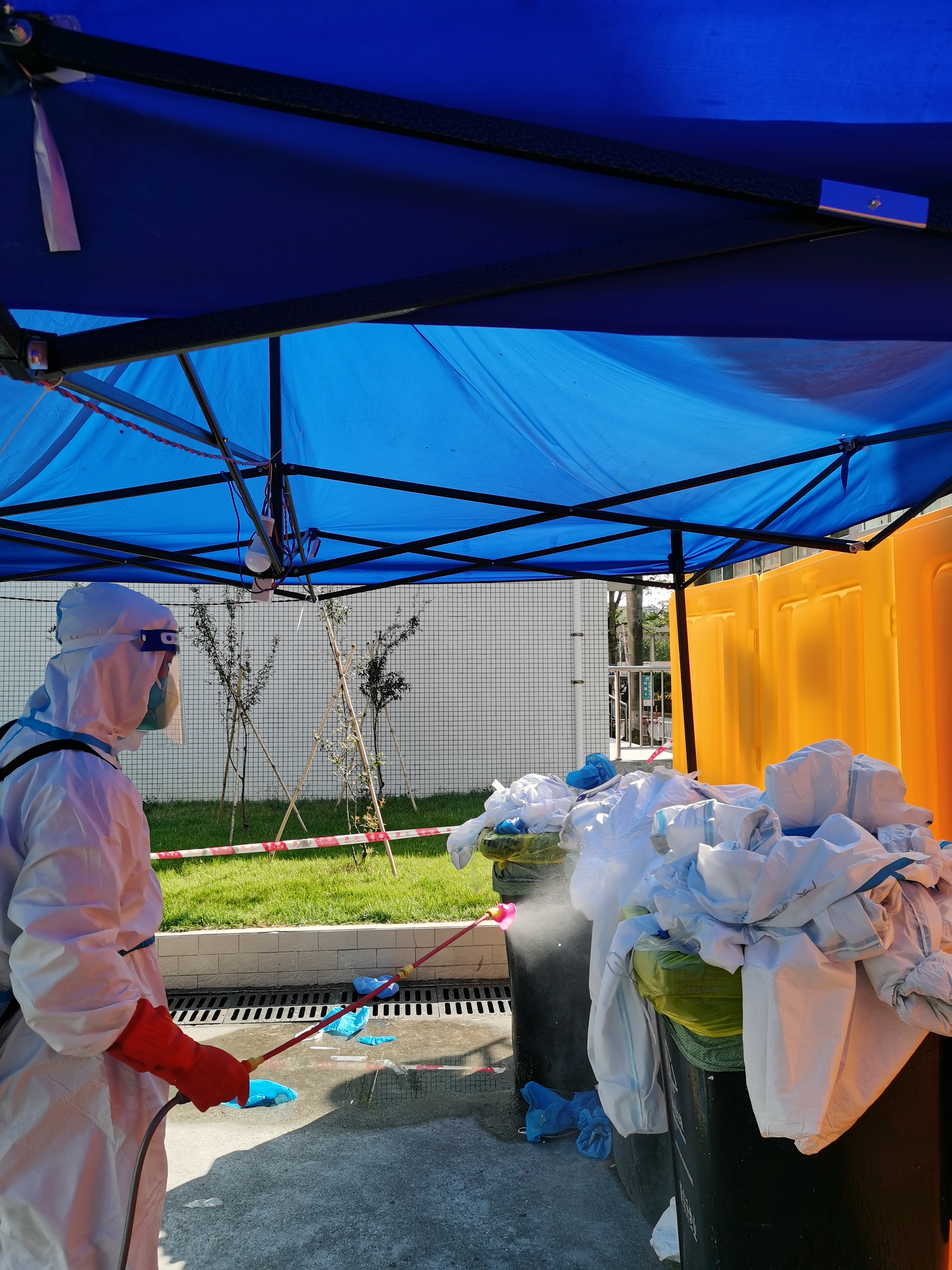 各部门部长、班长带队在每个小区门口摆放核酸检测场地帐篷,保障学生和核酸检测工作人员不受日晒雨淋。