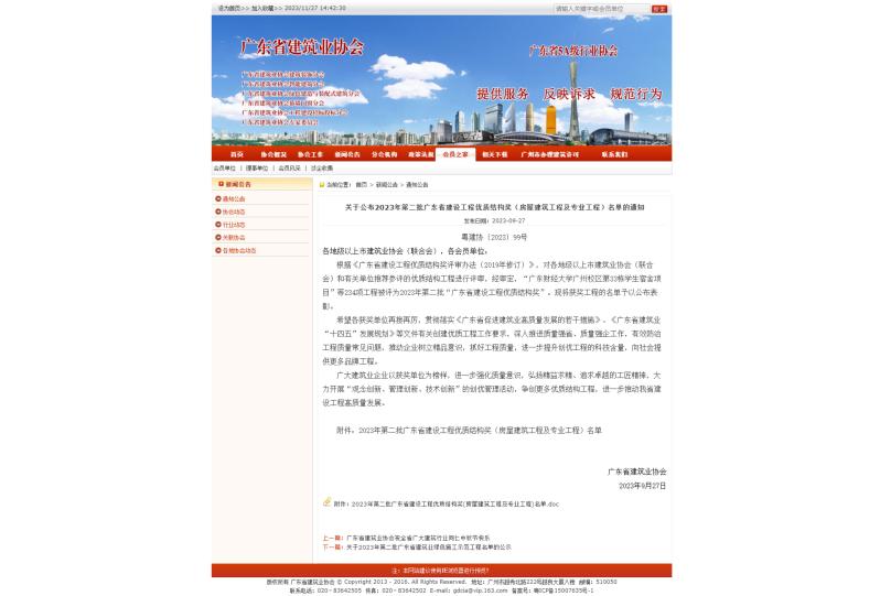 近日,广东省建筑业协会公布了2023年第二批广东省建设工程优质结构奖(房屋建筑工程及专业工程)名单。我校广州校区第33栋学生宿舍项目工程荣登榜单,获评“二〇二三年广东省建设工程优质结构奖”,这也是广东省建设工程优质结构最高荣誉奖。在此之前,该工程还获得了2022年“广东省建设工程项目施工安全生产标准化工地”、“广东省房屋市政工程安全生产文明施工示范工地”等荣誉。