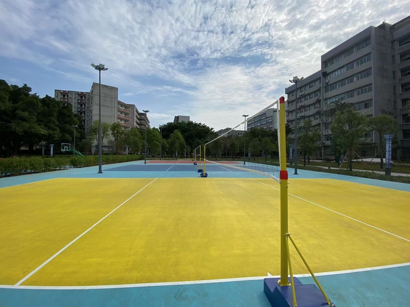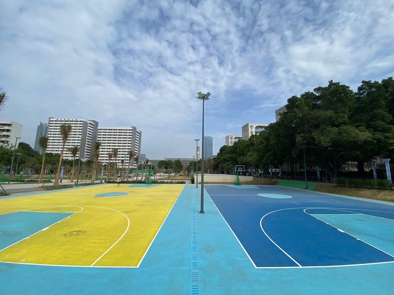 广州校区体育公园,位于南区田径场及博学楼北侧篮球场所在区域,占地面积约3万平方米,包括1个下沉式篮球竞技场、7个标准篮球场、5个标准排球场/羽毛球场、1个标准网球场、2个网球练习场、1个滑板场地、1个滑轮场地、1条550米的跑道等多个功能区域,每一处都透露着活力与精彩。